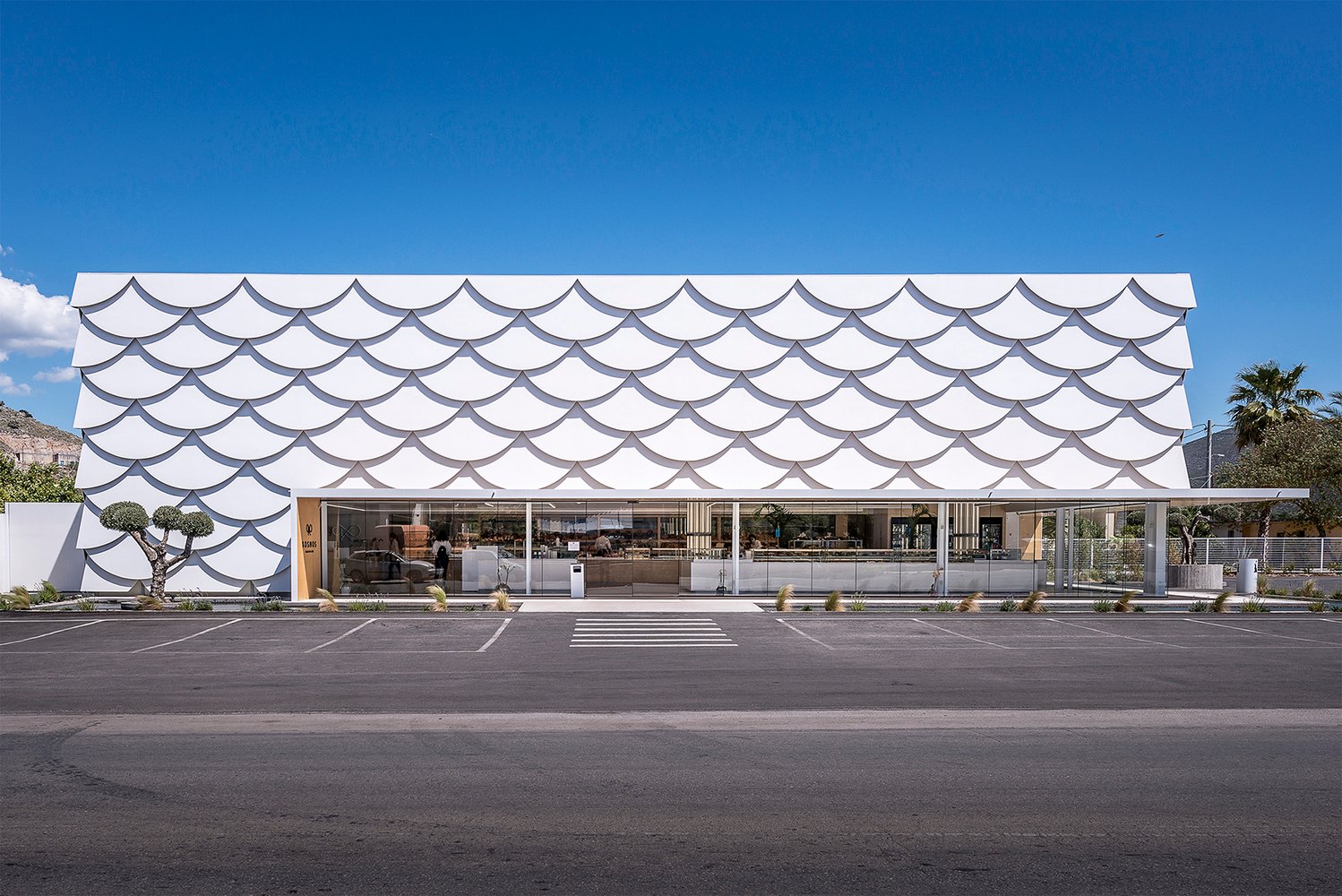 The Kosmos – Bakery & Coffee in Nafplion, Greece, is a modern food and coffee station designed within an existing steel structure at the city’s entrance. Situated in a semi-urban setting, the building’s dominant scale and surrounding open spaces called for a design that balances autonomy with integration into its busy roadside context.